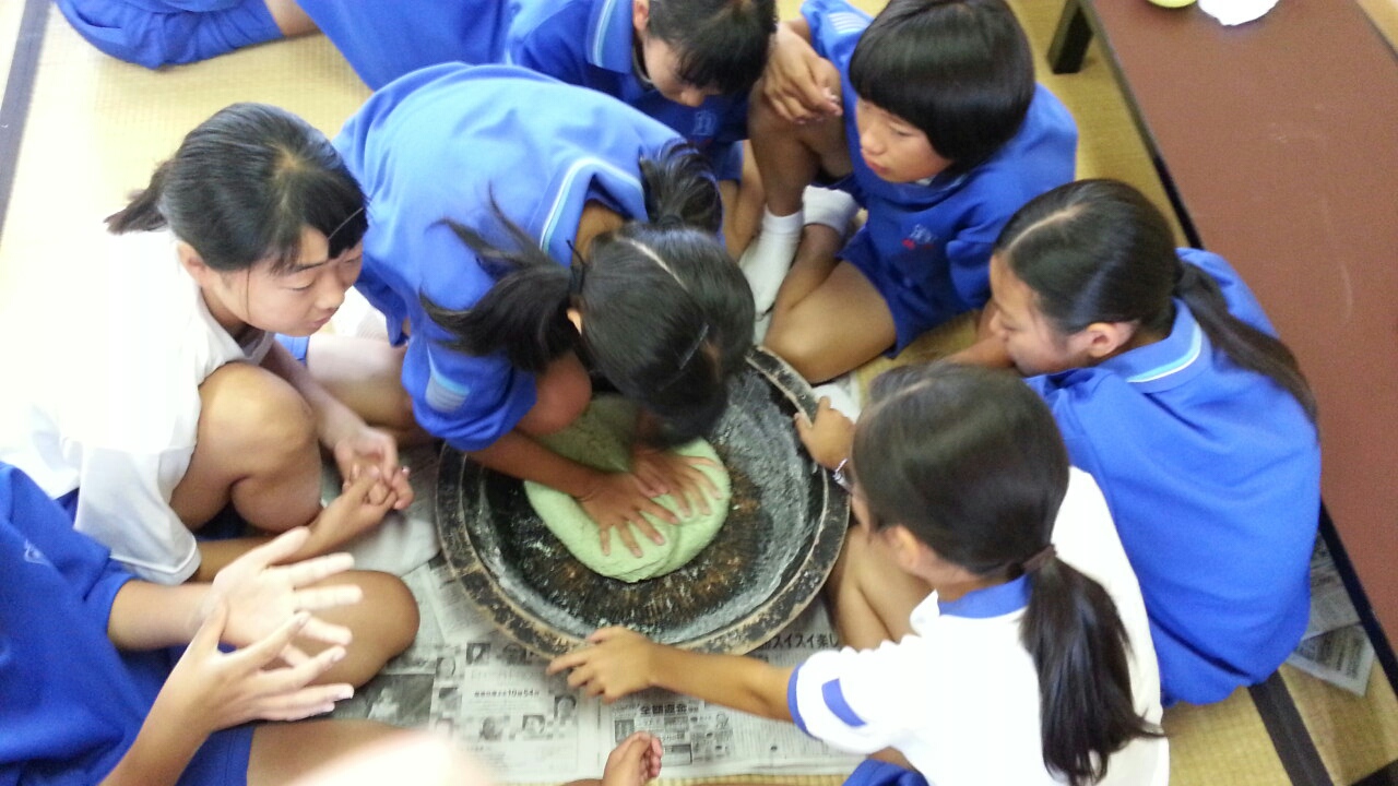 昨日は午前中体育館でわら細工、鍋敷き作りに挑戦しました。