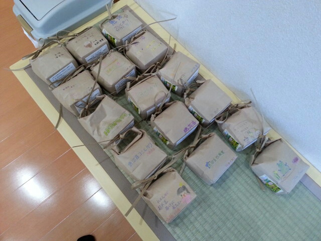 皆さんミニ米袋に色鉛筆でデザインし、3合のお米を詰めます。