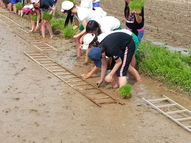 お昼に到着し、昼食後須原小学校近くで田植えです。