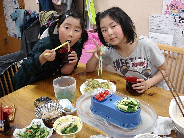 このそうめん流し器、電池で水が流れて、楽しそうな感じです。