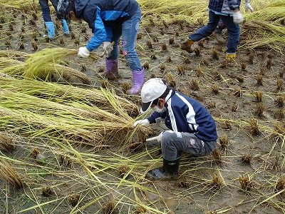民宿浦新さんの田んぼで稲刈りです。