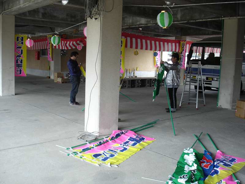 午後からは明日の商工祭の準備で須原第1体育館のピロティーへ。