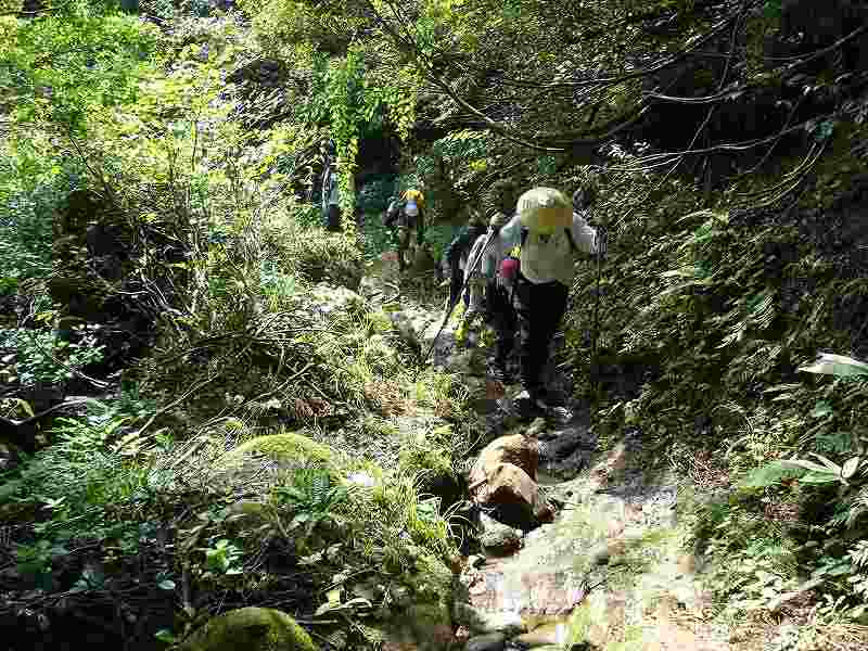 沢づたいを登るコースで、足元の悪い濡れている場所がたくさんあり