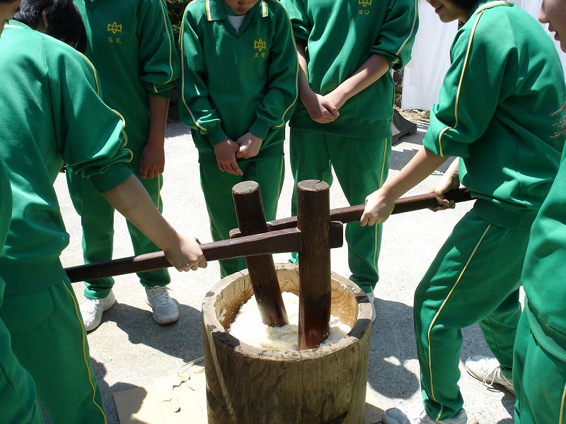 道の駅でおみやげ購入後、クラスに分かれて宿舎で昼食を兼ねたもちつき。