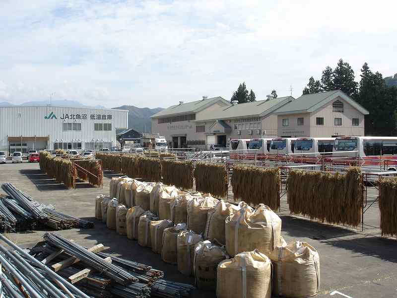 刈り終わった稲は、農業公社の方から、はざ掛けにしていただきます。