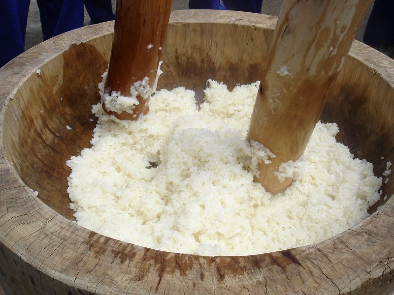 午前中は各クラスに分かれて、旅館民宿でもちつき体験。