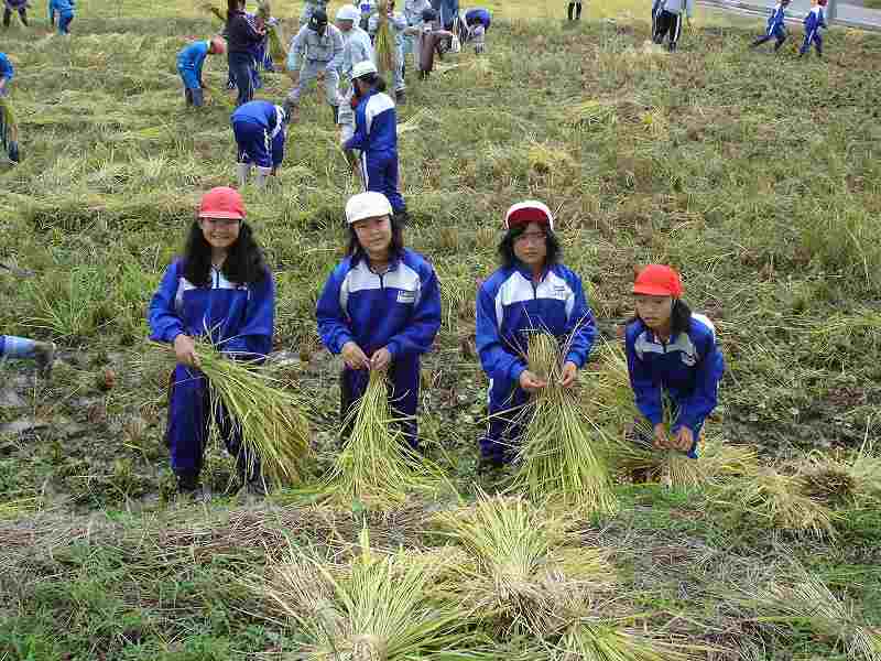 午前、須原小学校5年生が、学校田で稲刈りを行いました。