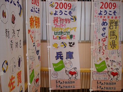 2階に上がる階段には、それぞれの思いを書いた10チームの垂れ幕がありました。