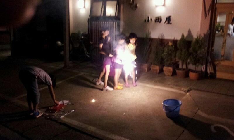 娘たちは玄関先で手持ち花火を楽しんでいます。