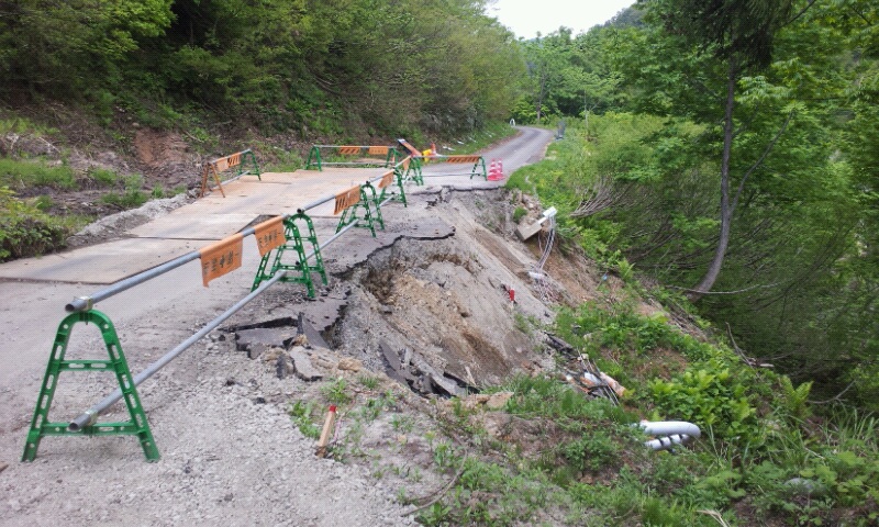 写真の手前500mの道路が大きく崩れています。