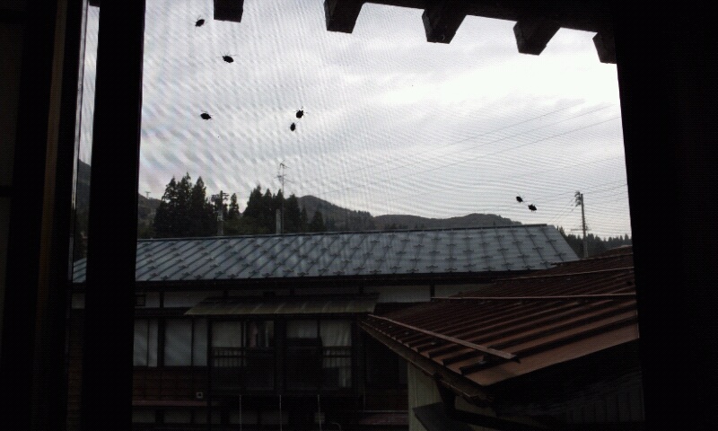 3時過ぎには客室の窓を閉めに行くと、網戸にカメムシの大群が・・・・