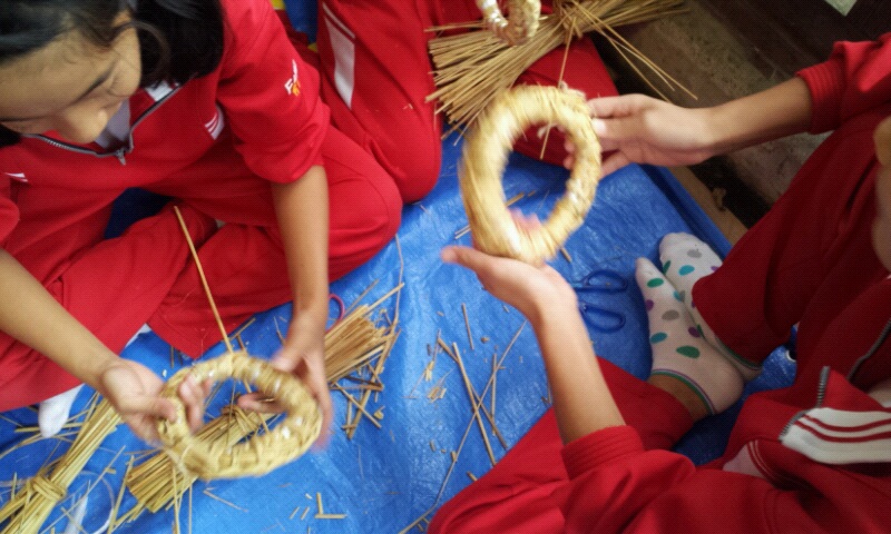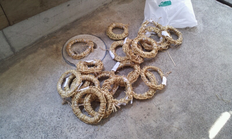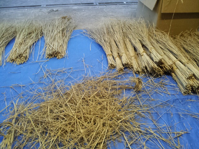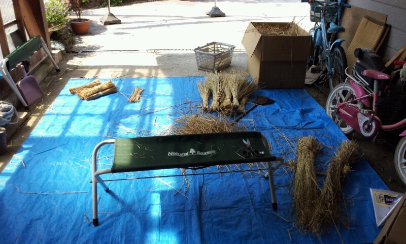 編みやすいようにわらを濡らしたので日陰干しをしています。
