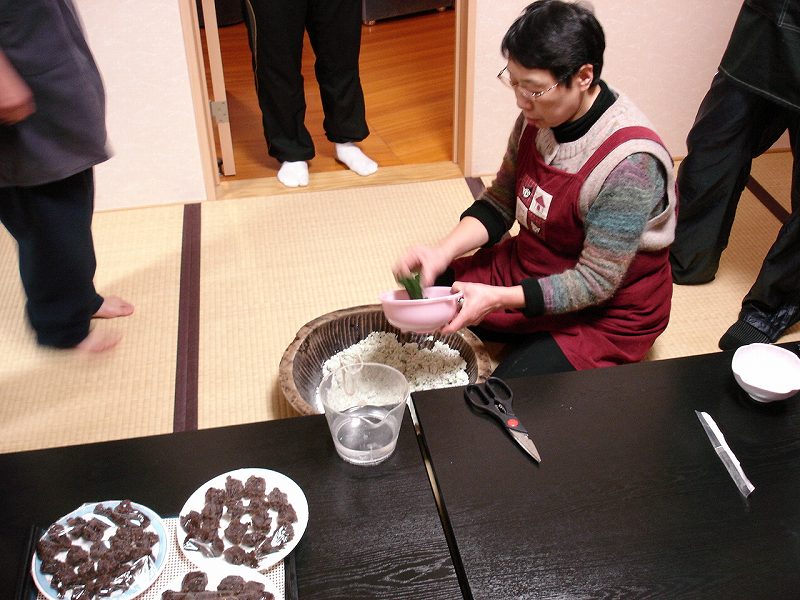 夜には笹団子作り、女将が講師となって・・・・
