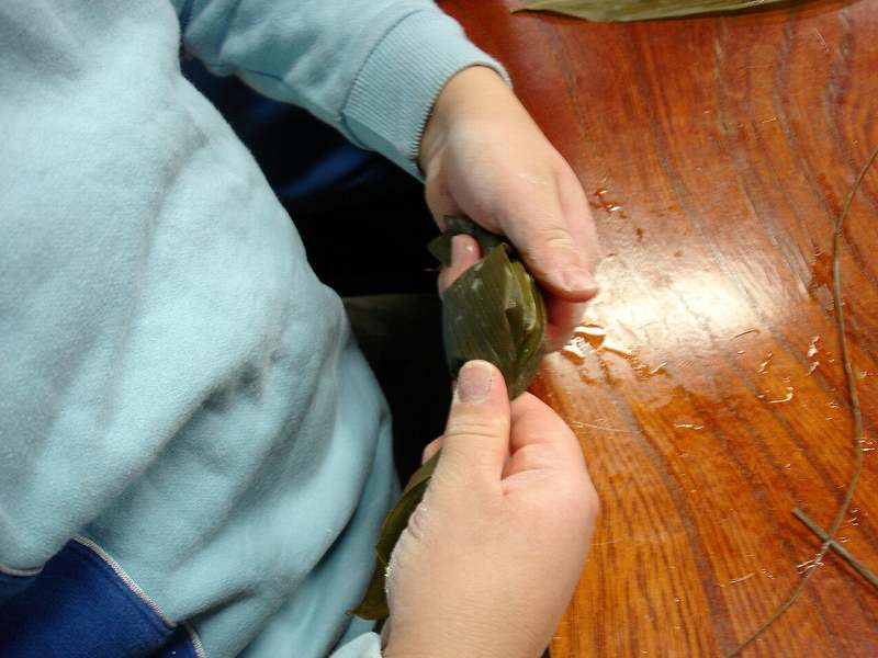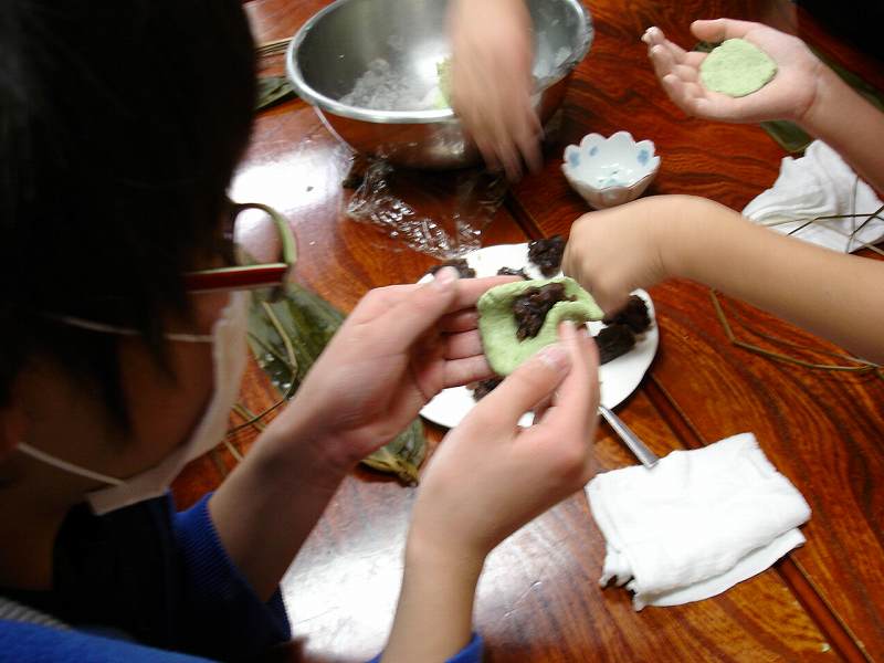 夕食後に女将が講師となって笹団子作り。