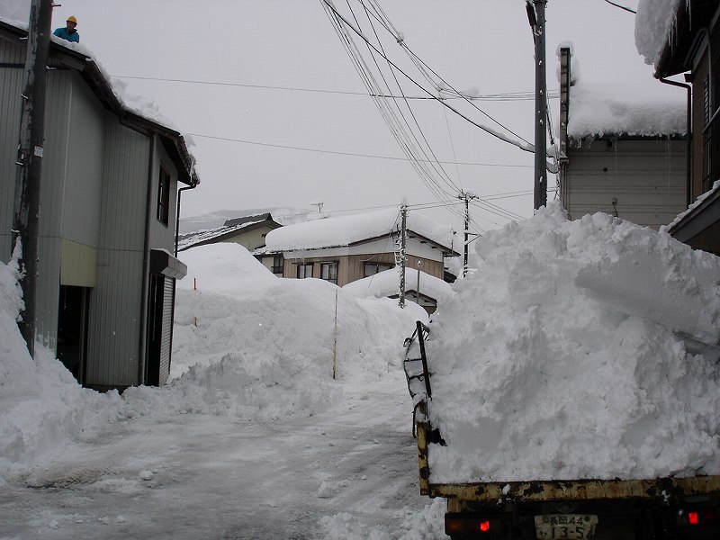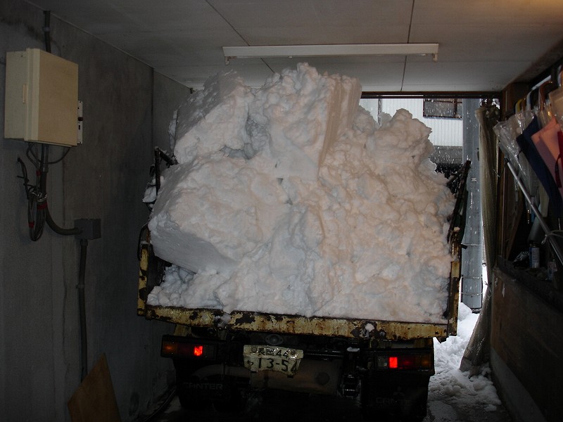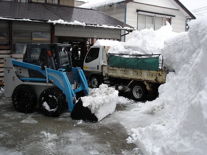 車庫の雪下ろし、ジョブサンと2トンダンプで排雪しています。