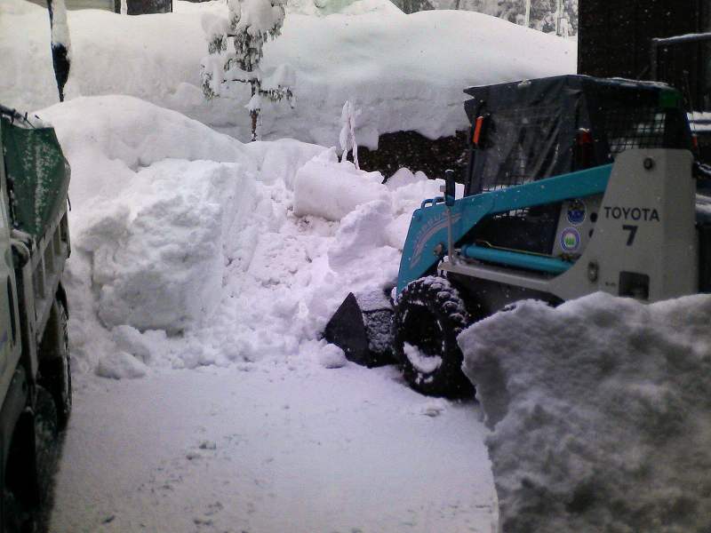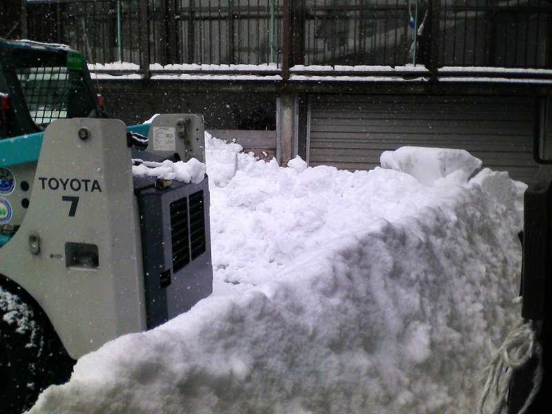 除雪車ジョブサンは一日フル活動、中庭に入りダンプで排雪しています。