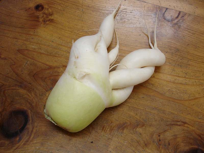 おじいさん収穫の小西屋の畑ではこんな変わったダイコンが・・・・・