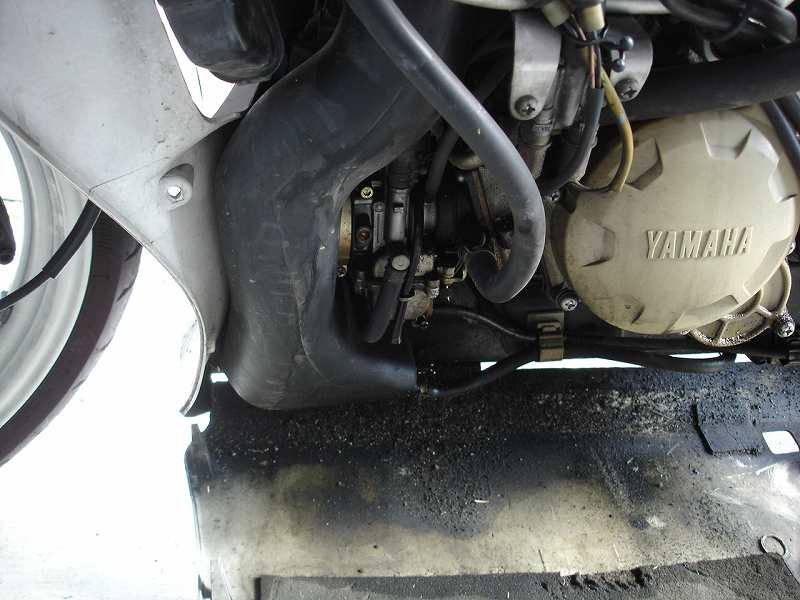 アンダーカウルをはずして、キャブレターのガソリンを抜いています。