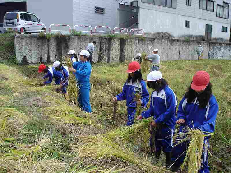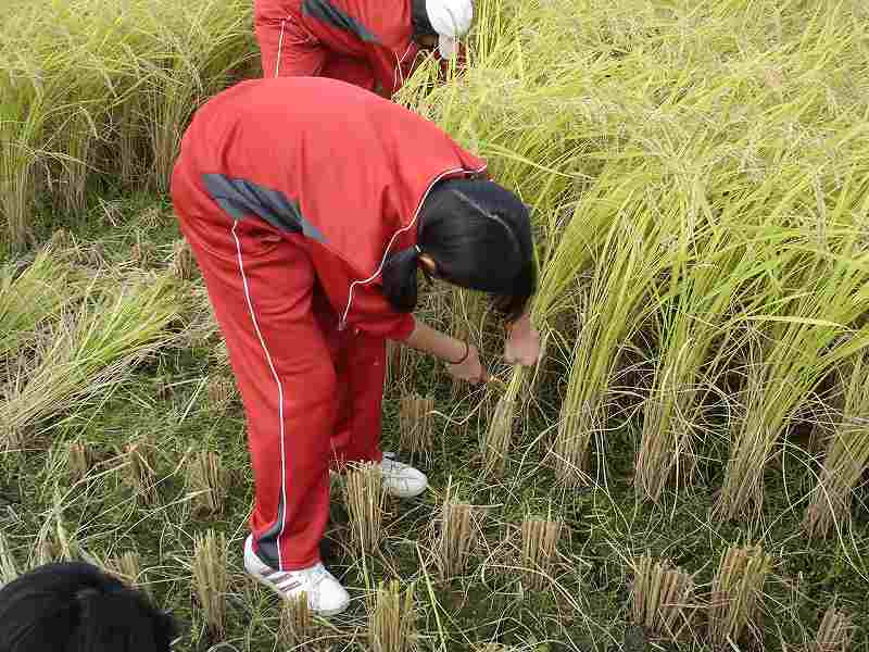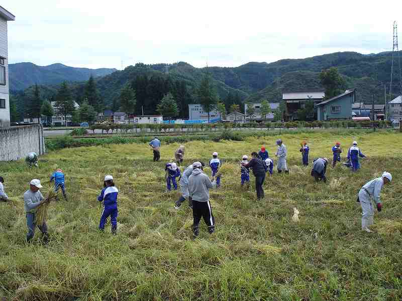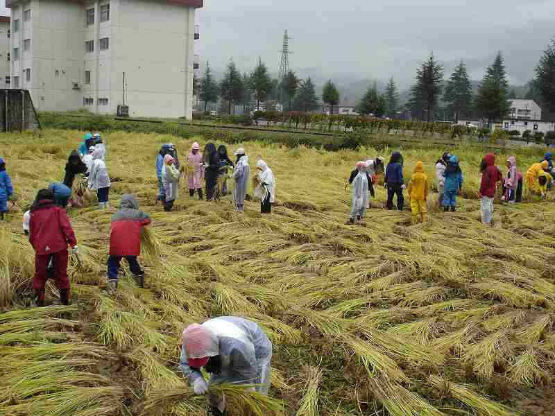午前、須原小学校5年生が、学校田で稲刈りを行いました。