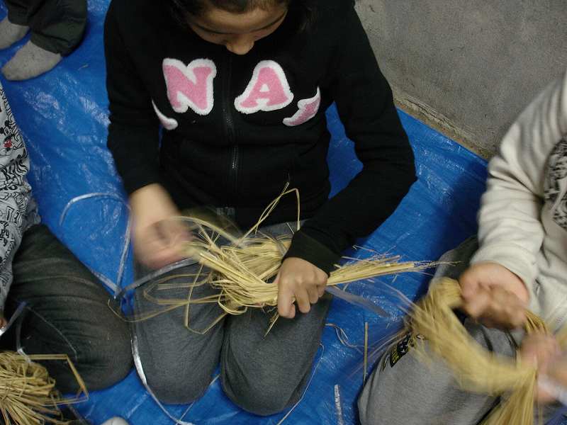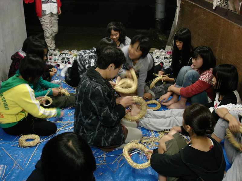 夜はわら細工、なべ敷き作りに挑戦。
