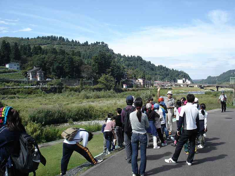 続いて、魚野川と佐梨川の合流地点で川の学習、