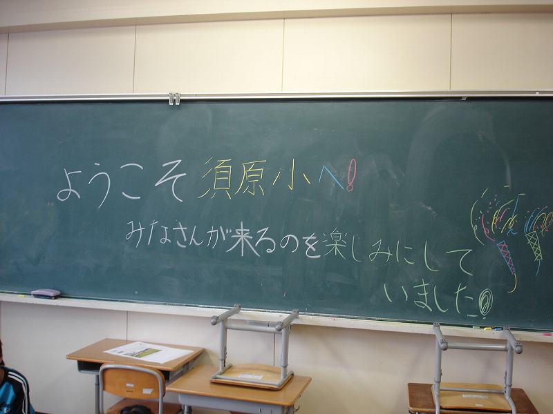 黒板には「ようこそ 須原小へ みなさんが来るのを楽しみにしていました」