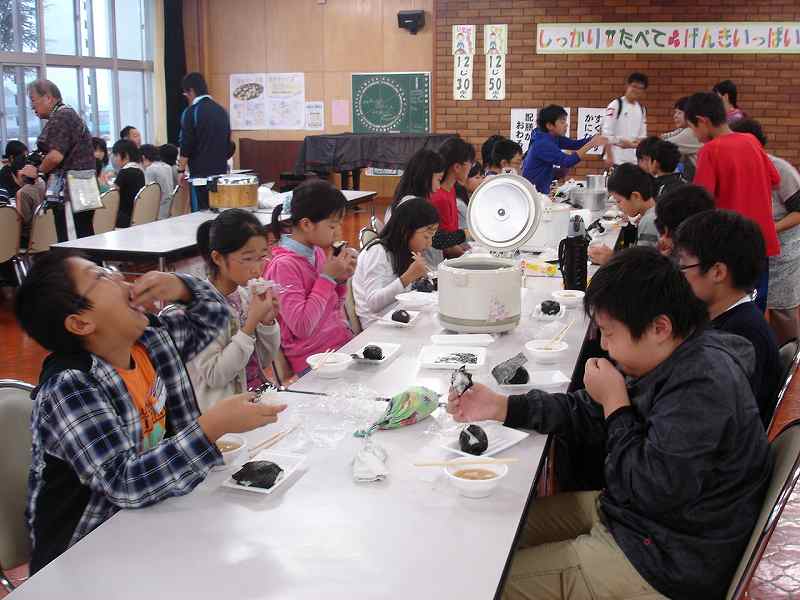 昼食には旅館民宿で炊いたご飯を使っておにぎり作り。