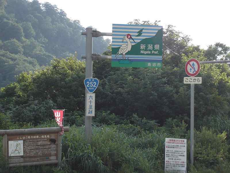 福島県境、六十里峠トンネル出口新潟県側にはときの看板があります。
