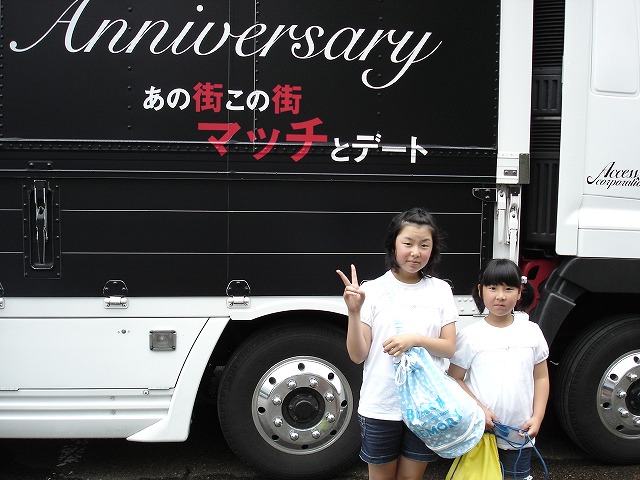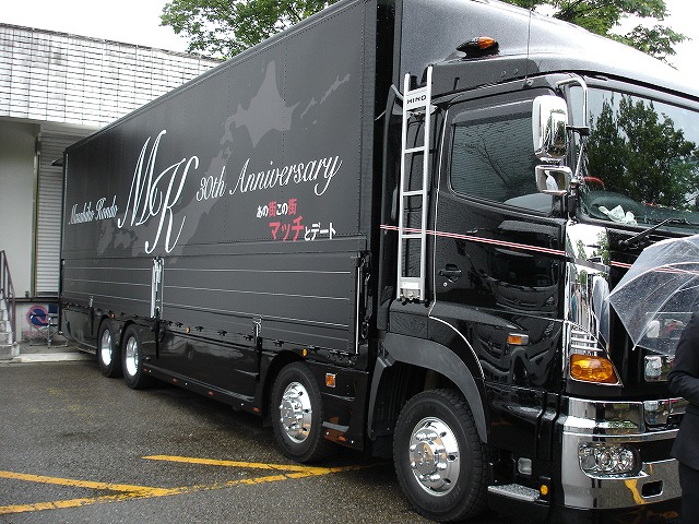 楽屋入り口玄関には機材用の大型トラックがあり、記念写真。