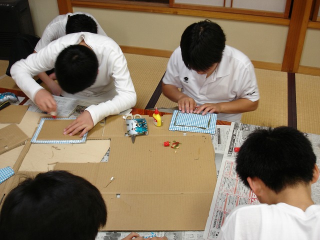 夜には宿舎での工作体験で小西屋はエコフォトフレーム作りに挑戦しました。
