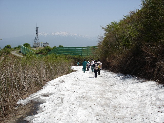 約2時間程で山頂へ、山頂の林道にはまだ雪が一部残っていました。