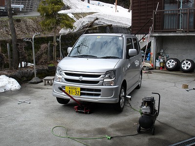 雪の心配がなくなりましたので、中庭でタイヤ交換をおじいさんとしました。