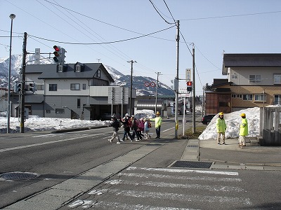 明日は春の交通安全週間で小中学生の登校時間に、須原小学校近くの信号交差点で