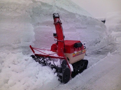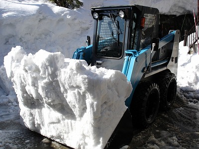 駐車場では除雪車ジョブサンで集めて除雪機で飛ばしています。