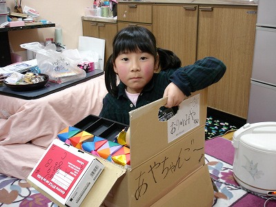 次女1年生の文乃はダンボールで「あやちゃんごーおりがみや」で遊んでいます。