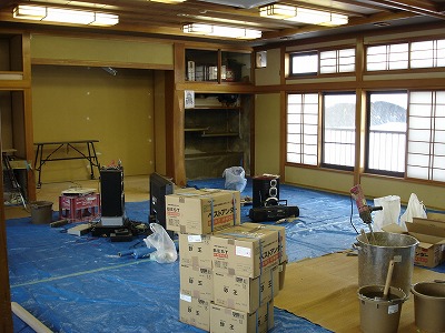 大広間の壁ぬり(土壁)と客室のふすま紙の張替えを行っています。