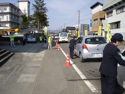 そんな中、午後から「春の全国交通安全運動」の一環として、家庭訪問と交通安全指導所を設置し、勤労体育館前の国道で、一台一台に声をかけて、安全運転を呼びかけました。