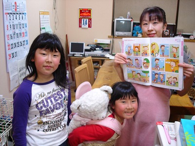 お母さんはECC(英語教室)の本を広げて、文乃は赤ちゃんをおんぶしています。