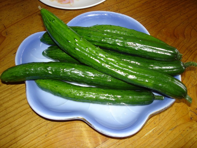 このおいしそうなキュウリ、じいちゃんの朝どりです。