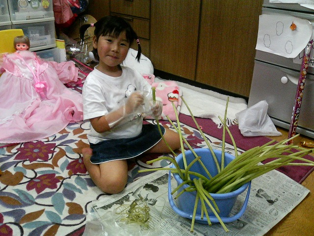 風呂にも入らず、楽しそうにフキの皮むきをしてました。