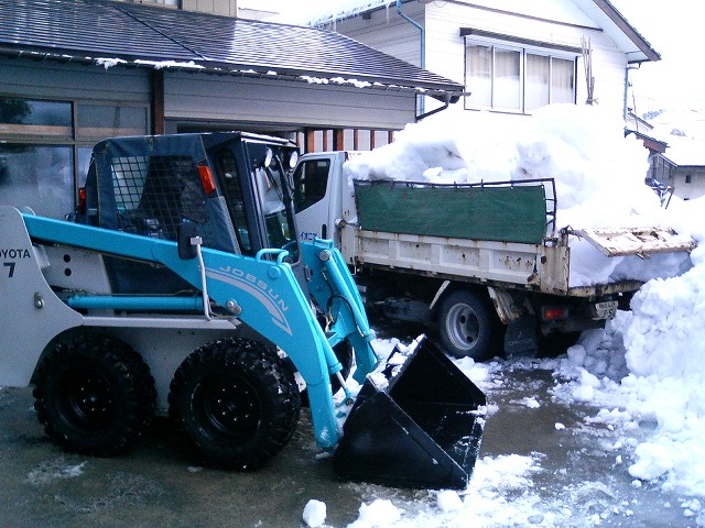 ジョブサンで8回ぐらい積み込むと既に満杯で、1kmちょっとの農業公社の脇にある雪捨て場(川に落ちる)に行って捨てています。多い時は1日15回ぐらい往復します。ちょっと時間は掛かりますがこのダンプカー大変重宝しています。あっという間に片付きます。下屋根は灯油ボイラーで暖めたお湯を回した融雪屋根ですが、