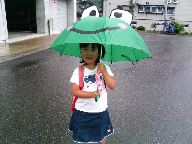下の娘5歳のあやのですが、保育園からバスで帰ってきて、お気に入りのカエルのかさをさしています。
