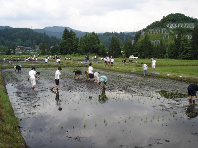 今日から2泊で東京のK中学校の2年生110名が自然体験の移動教室で魚沼市にお越しになりました。写真は田植え体験の様子です。クラス毎に4枚の田んぼにわかれ上手に植えてました。雨の予報でしたが、晴れて本当に良かった。