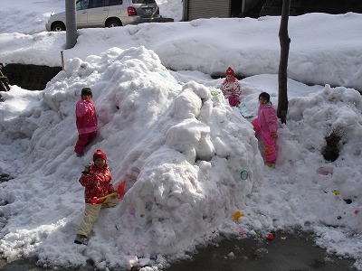 日中は晴れて比較的暖かい一日でした。久しぶりに晴れたようなきがします。中庭には除雪車で集めた雪が2m程積んであり、娘達は近所の子供達と一緒に滑り台をしたり、雪に色をつけたりして2~3時間楽しんでいました。