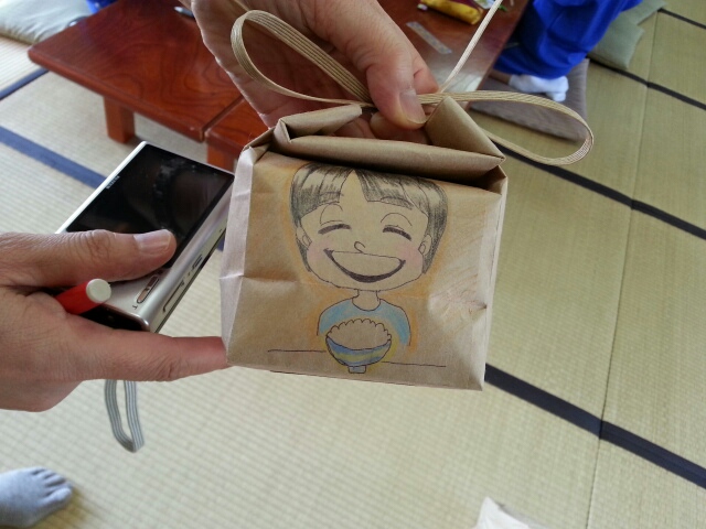 お米の袋にイラストや文字を書きました。