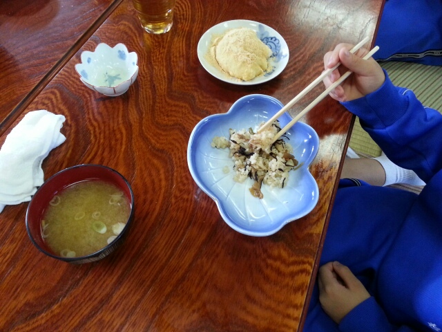 昼食はきなこもちと五目御飯となめこ汁で・・・・・