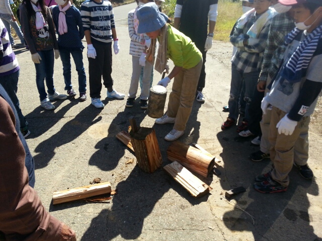 のこぎりを使って一生懸命切りました。