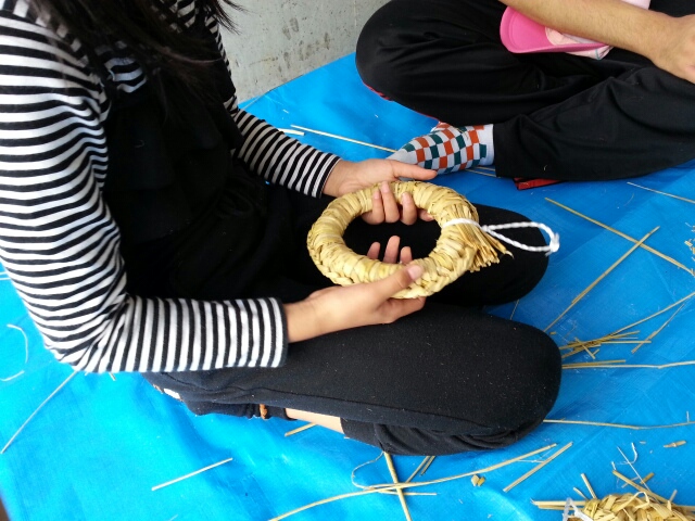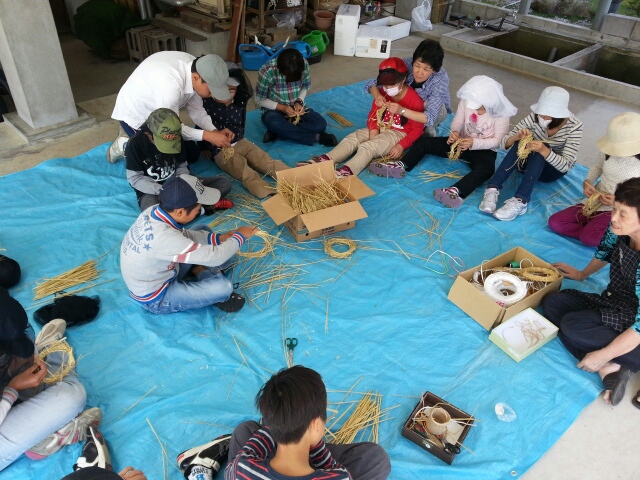午前は各宿舎でわら細工「なべ敷き作り」。