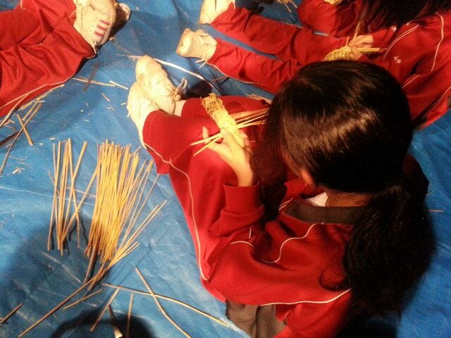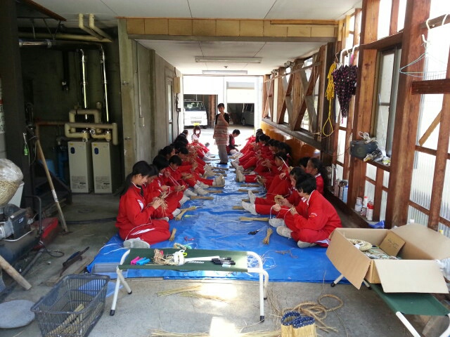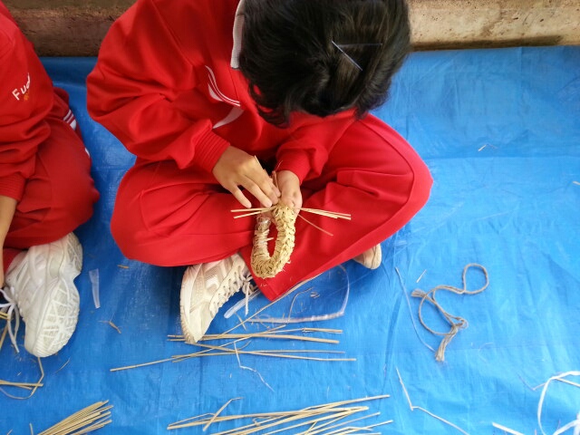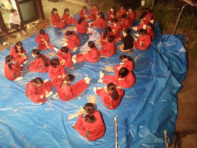 夕食後は各宿舎でわら細工「鍋敷き作り」