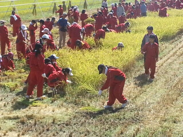 響きの森公園で昼食後、宿舎近くの田んぼで稲刈りです。